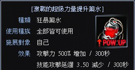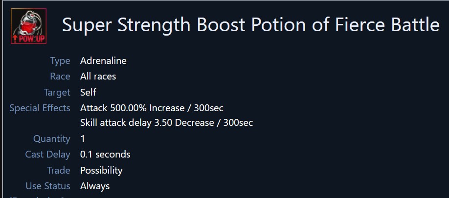 ![]() Super Power-Up Potion for Intense Battles | It can temporarily and greatly enhance abilities after use. (500% ATK, Skill attack delay 3.50 Decrease for 300 seconds) |