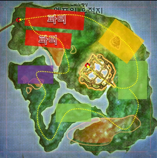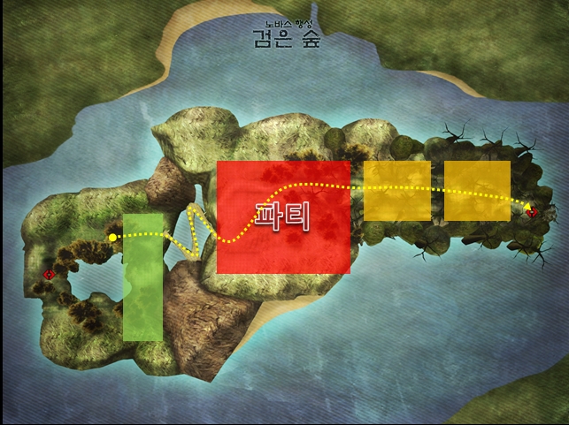 The circles in the image indicate good hunting locations. The one indicated as party is rather difficult for solo play, so form a party there. Now that you’ve checked the road, head to the Forest of Frozen Time! The Forest of Frozen Time has a simple map, as shown below. This place has also been indicated with areas for solo play and party play.