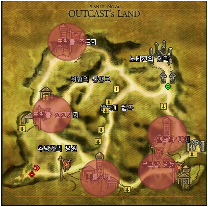 Here, monsters form villages, scattered around the lands. The red on the radar below shows locations where monsters are clustered. In Outcast Land, it is recommended you enter the monster villages and hunt in one location. There is a merchant a little north of Cremul Outpost, who will provide you with emergency medication.
