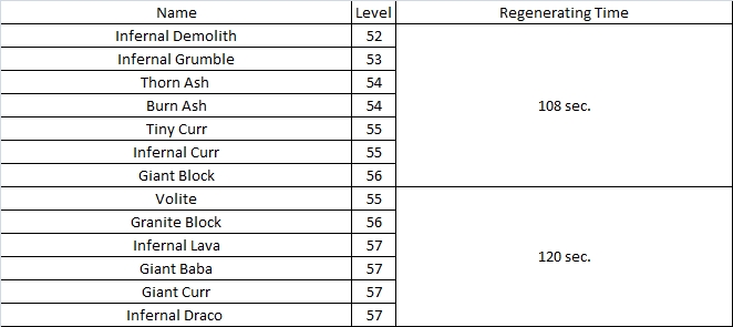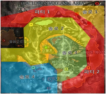 As shown in the image above, the areas for solo play and party play has been separated. Cauldron Volcano has strong monsters, so check with the image to set your boundaries. The chart below will help you determine the regen time and level of monsters.