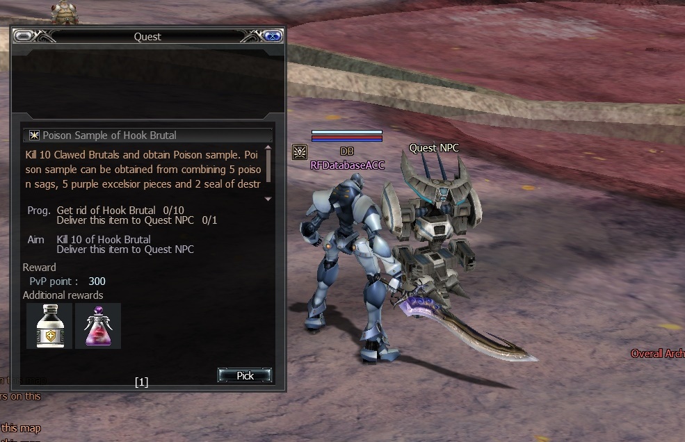 Kill 10 Clawed Brutals and obtain Poison sample. Poison sample can be obtained from combining 5 poison sags, 5 purple excelsior pieces and 2 seal of destructions.