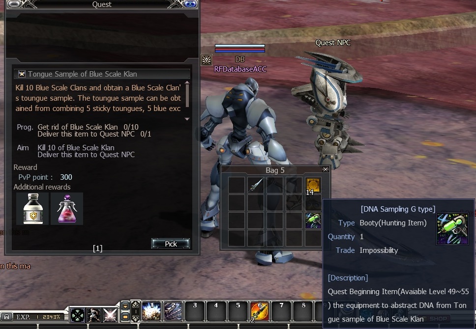 Kill 10 Blue Scale Clans and obtain a Blue Scale Clan’s tongue sample. The toungue sample can be obtained from combining 5 sticky toungues, 5 blue excelsior pieces and 2 seals of destruction.